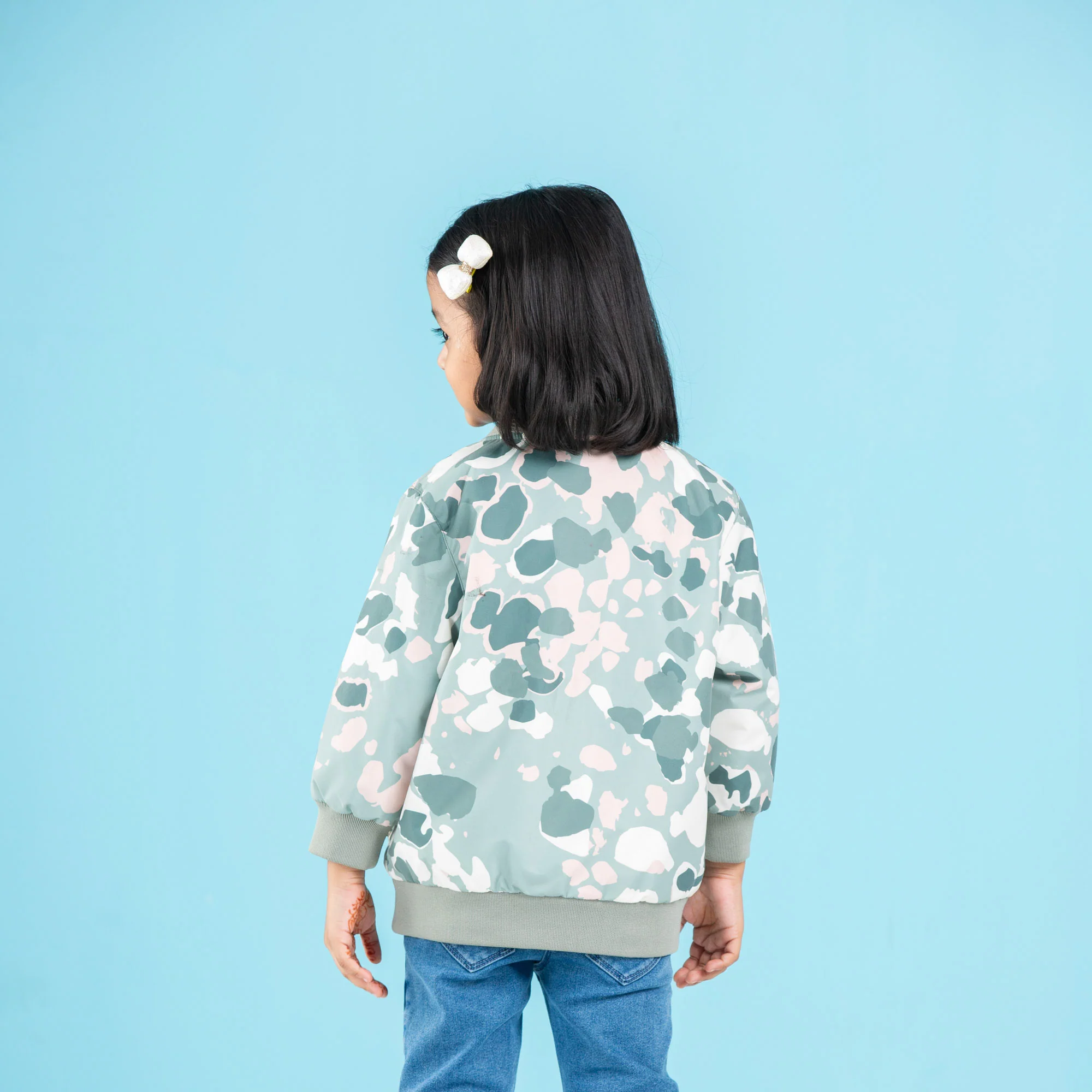 This Baby Girls Bomber Green/White AOP is the perfect outerwear for cool days. Its lightweight fabric ensures comfort and breathability, while its green and white design provides a stylish and timeless look. Perfect for any special occasion.